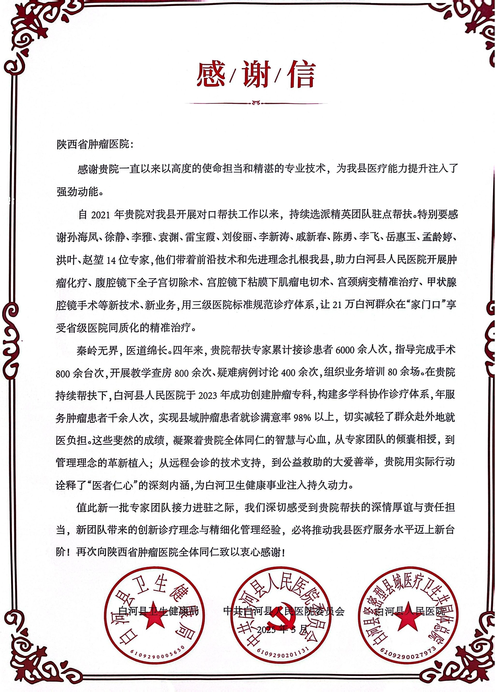 会上,白河县人民医院党委书记郭猛对我院长期以来的帮扶工作表示感谢。白河县卫健局副局长杨允涛感谢省肿瘤医院开展帮扶工作的深情厚谊与责任担当,肯定了专家们在帮扶期间为白河县人民医院医疗业务、学科建设、人才培养等方面作出的突出贡献,使帮扶医院在科室管理、医疗技术等方面都有了质的飞跃,切实有效缓解了白河县群众看病难、看病贵、看病远的医疗问题,并现场宣读了给伟德官网下app官方网站的帮扶感谢信。