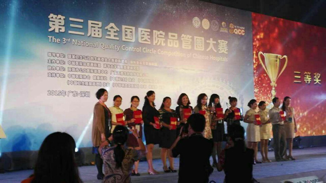 2015年10月23日-25日,由中国医院品管圈联盟、清华大学医院管理研究院主办的“第三届全国医院品管圈大赛”在深圳会展中心举行。来自全国28个省市、232家医院、243个品管圈分为三级医院护理类、三级医院综合类、三级专科医院类、二级医院类四个场次分别进行品管圈成果汇报。我院静脉药物配制中心同心圈以“降低成品药物配制胶塞的发生率”为汇报主题,一路过关斩将,最终成功获得大赛三等奖。