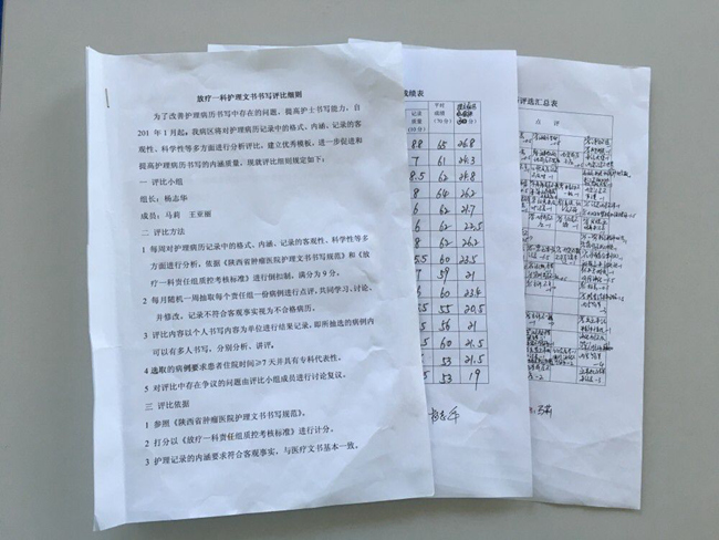 这次活动由放疗医院一病区全体护理人员参与,通过评委打分和分组讨论相结合方式对每个人的参赛病历进行点评,体现公开、公平、公正原则。整个评比包括三个环节:第一、科室每人提交一份本年度内以自己为主要书写者的护理病历。由三位评委依据《伟德官网下app官方网站护理文书书写规范》和《放疗医院一病区责任组质控考核标准》从病历的代表性、规范性、及时性、全面性、综合质量等方面“背靠背”打分;第二、由五位评委,在翻阅本年度平时病历的基础上,结合工作中对每个人书写态度、能力的认知,给出平时成绩;第三、全科护理人员分成两个小组,对所有的参赛病历进行点评,评委可结合大家的意见再次修正自己的打分,最终根据不同环节权重比算出总得分。