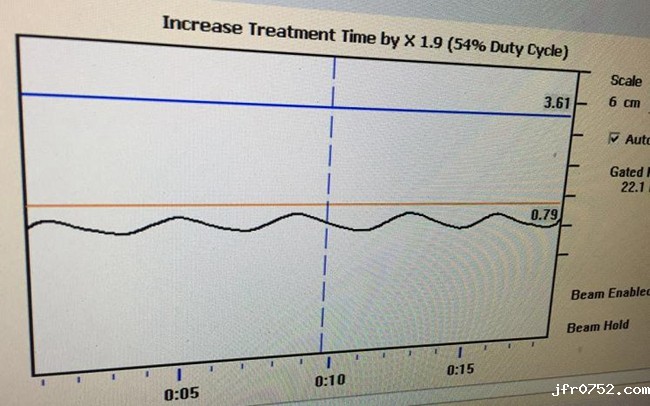 放疗医院在常务副院长杨怡萍主任医师带领下开展“呼吸门控技术“,采用一台红外摄像机来跟踪固定在患者胸部或腹部的体外标记,然后系统通过呼吸运动波形曲线来描述患者的呼吸运动模式。在放疗计划中,我们已经通过所获得的CT图像建立了一个在特定时相对靶区进行放射的计划,在治疗过程中当靶区进入计划治疗区域时系统会自动打开射线束。若患者由于呼吸异常等原因造成呼吸曲线偏离阈值时,系统会自动关闭射线。这样,可通过精确靶区的勾画有效减小计划靶区照射体积,降低正常组织受照射剂量和毒副反应。