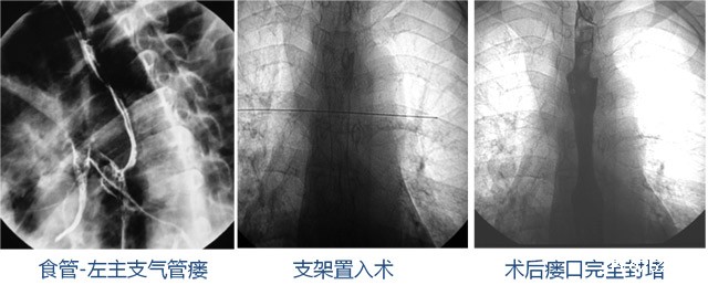 病例1:食管癌伴食管气管瘘,食管支架置入术后,造影剂通过通畅,未见造影及漏出