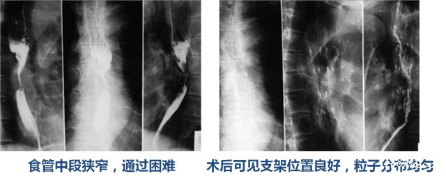 病例3:食管癌行125I粒子支架置入术,食管中段狭窄,通过困难 术后可见支架位置良好,粒子分布均匀。