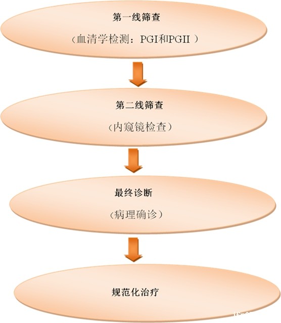 胃蛋白酶原I(PGI)和胃蛋白酶原II(PGII): 是胃癌癌前病变—慢性萎缩性胃炎的标志物,通常使用PG I浓度≤ 70μg/L且PG I/II ≤ 3.0作为诊断萎缩性胃炎的临界值,国内高发区胃癌筛查采用PG I浓度 ≤70 μg/L且PG I/II ≤ 7.0;