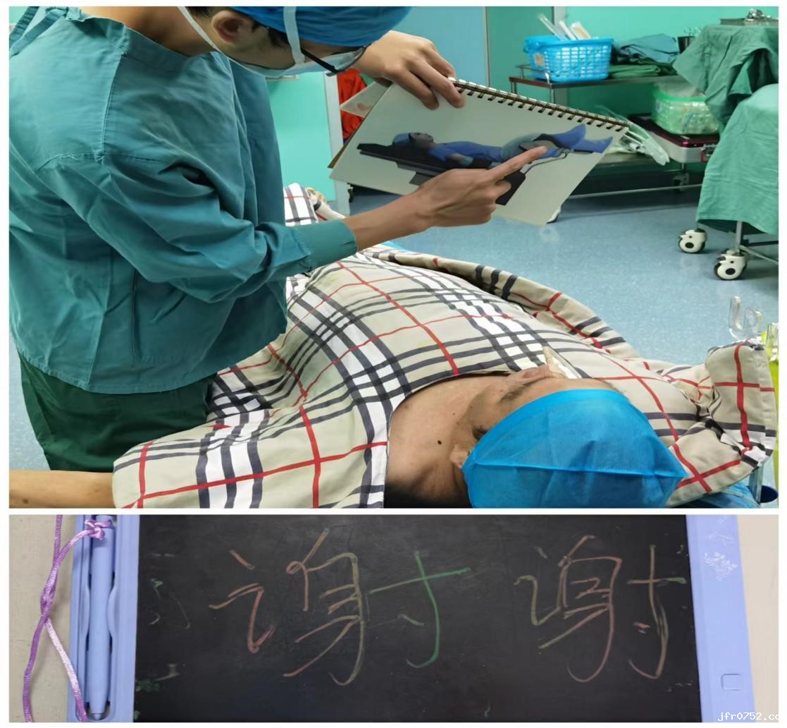 手术当日,手术室护士拿出对话卡与赵先生交流时,他原本担心手术的脸庞“多云转晴”,连声道谢,围术期的沟通配合也顺畅良好,最终手术顺利,安返病房。