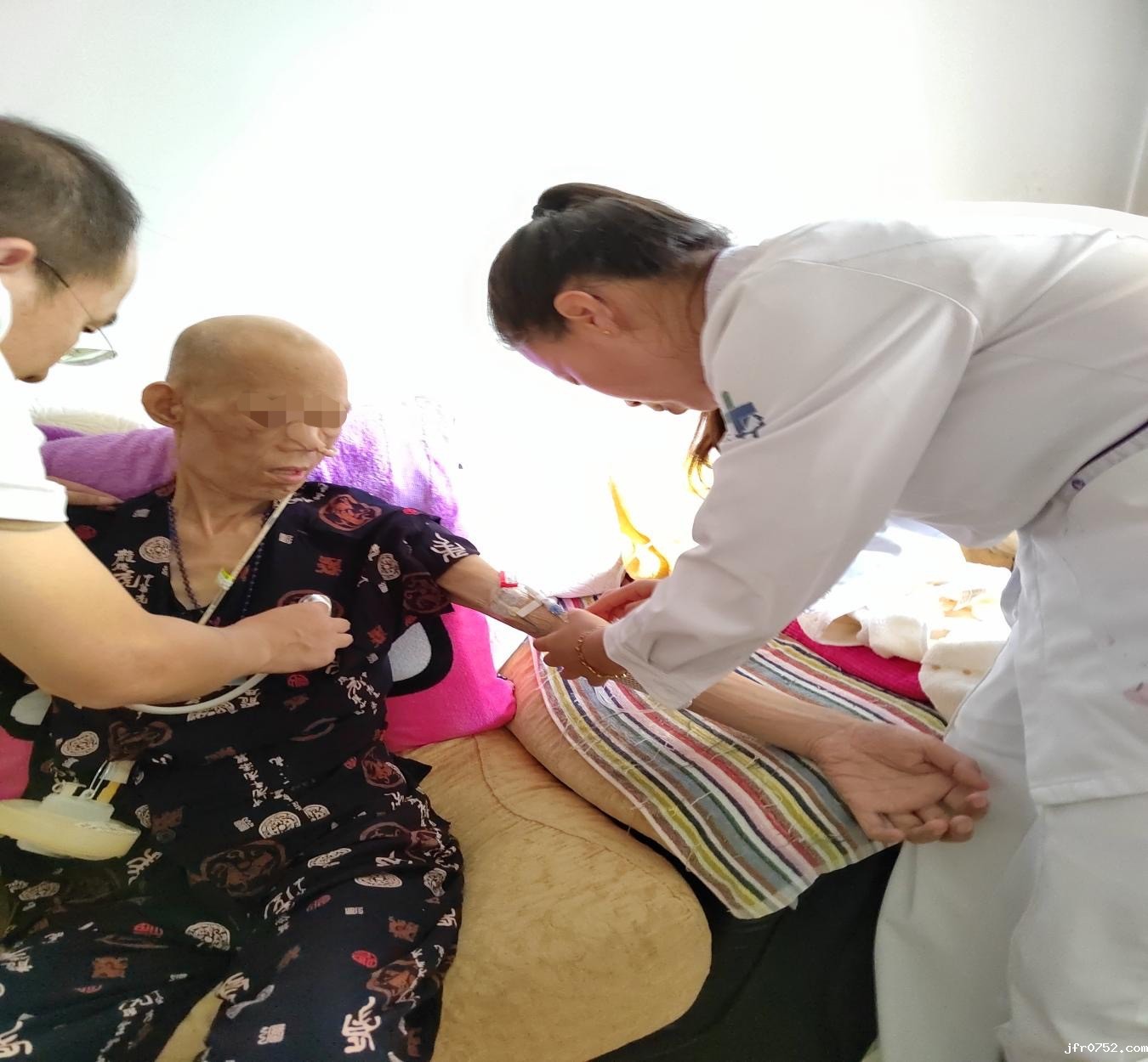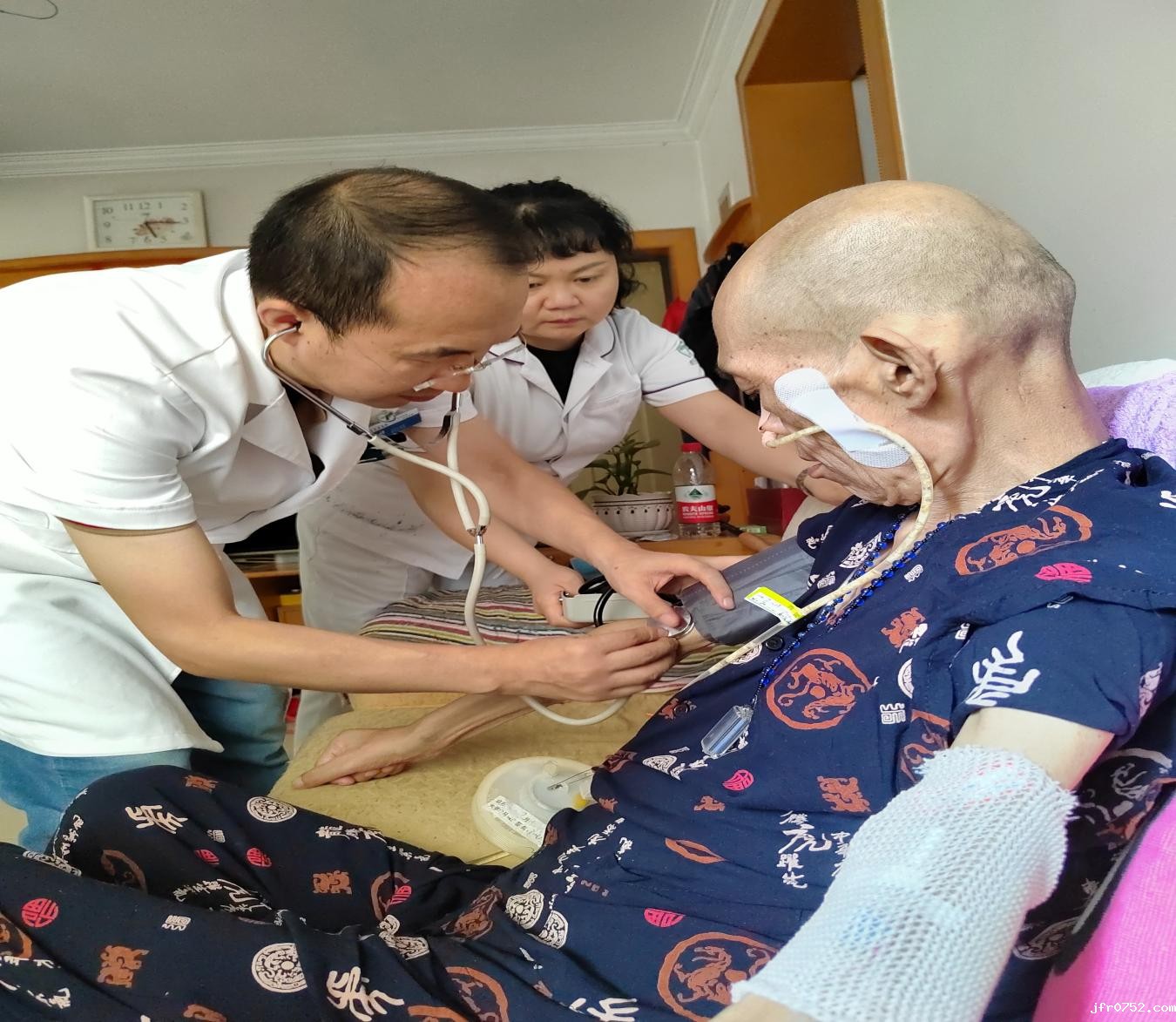 伴随一阵脚步声,在内三科唐红霞护士长的带领下,苏智祥副主任医师和周佩、周向梅、张秀萍主管护师等五名医护人员来到老人家里,苏大夫对老人的病情进行了详细的问诊及细致的查体,了解患者居家护理中存在的困难,营养学组护士周佩就患者饮食营养给与了专业指导和建议,嘱其居家应以高蛋白、高纤维、高维生素流食为主,适当增加一些高营养半流食,肿瘤专科护士周向梅为患者细心的更换了鼻胃管并给其家属进行了专业的日常使用及维护示教,PICC专科护士给患者进行PICC维护,唐红霞护士长给患者详细讲解了PICC在日常使用过程中的维护细节及注意事项。老人不善言辞,只言片语满是感谢,瘦削的脸庞难掩笑意,枯瘦的手紧紧攥住苏医生的手,颤抖而有力,那一刻,画面定格......