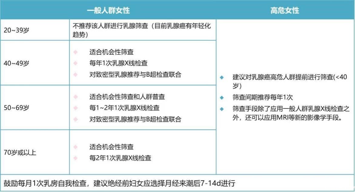 乳腺癌是乳腺上皮细胞增殖失控,导致恶性转化的疾病。这种恶性转化可导致肿瘤形成,并可能扩散到身体的其他部位。乳腺癌的早期症状可能包括乳房肿块、皮肤凹陷、皮肤水肿、乳头溢液、乳头内陷或乳房疼痛等。然而,这些症状不一定都会出现,因此定期进行乳腺癌筛查至关重要,在乳房出现症状或者肿块之前发现肿瘤,可以大大提高乳腺癌的治愈率。目前临床上常用的乳腺癌筛查方法为X线(即钼靶检查)和乳腺彩超;发现疑似病例的补充检查措施可以选择核磁共振检查。有乳腺癌一般风险的人群,不同年龄段的女性,可参考如下筛查方案: